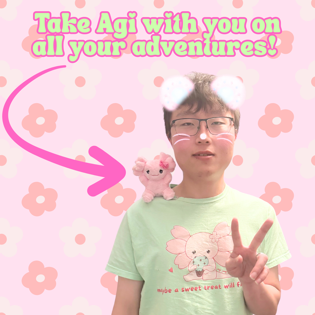 Conventions, cafés, or just running errands, Agi is ready to be your snuggly, clingy, adorable sidekick!